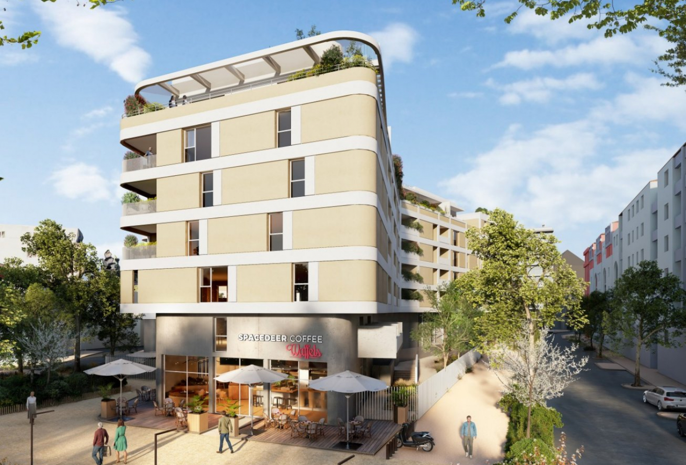 Depuis la rue de Moularès, le bâtiment se déploie en une ondulation continue, s’étirant jusqu’à la confluence des rues de Sept Cans et du Petit Train. Posé sur un socle sombre, il élève ses étages lumineux vers le nord, où sa façade s’affirme telle une étrave. Dans le mouvement de ses courbes se glissent des poches de verdure, qui s’étendent doucement jusqu’au parc situé au sud, véritable cœur battant de cet ensemble. Les lignes sont souples, déliées, dessinant des creux protecteurs où s’ouvrent de généreux espaces extérieurs. Ces lieux de respiration prolongent naturellement les logements, pour la plupart traversants, et entretiennent un dialogue subtil entre intérieur et paysage. Proche du quartier Port-Marianne et de la nouvelle Mairie, la résidence est idéalement située au cœur de la ZAC Consuls de Mer. Un quartier qui privilégie l’intégration du végétal dans le milieu urbain. Les rives arborées du Lez sont toutes proches. Les pistes cyclables permettent de profiter des nombreux espaces verts tels que le parc Georges Charpak ou le bassin Jacques Cœur. Ces lieux de promenades végétalisés sont de véritables oasis de fraicheur et de sérénité en plein cœur de ville. Sous conditions de ressources, voir conditions à l'agence.